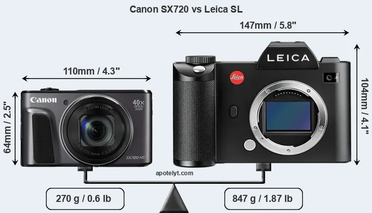 The above size and weight comparisons are to some extent incomplete and possibly misleading, as the SX720 has a lens built in, whereas the Leica SL is an interchangeable lens camera that requires a separate lens. Attaching the latter will add extra weight and bulk to the setup.