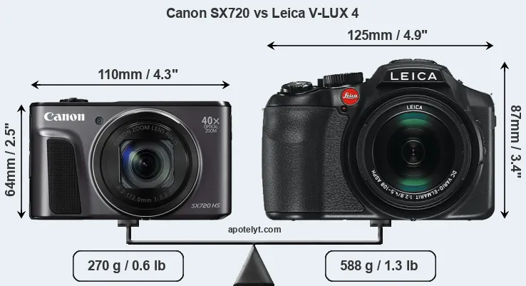 If the front view area (width x height) of the cameras is taken as an aggregate measure of their size, the Leica V-LUX 4 is considerably larger (54 percent) than the Canon SX720. Moreover, the V-LUX 4 is substantially heavier (118 percent) than the SX720. In this context, it is worth noting that neither the SX720 nor the V-LUX 4 are weather-sealed.