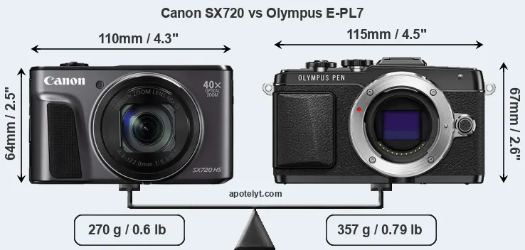 An illustration of the physical size and weight of the Canon SX720 and the Olympus E-PL7 is provided in the side-by-side display below. The two cameras are presented according to their relative size. Three consecutive perspectives from the front, the top, and the back are available. All width, height and depth dimensions are rounded to the nearest millimeter.