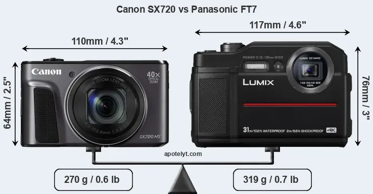 The side-by-side display below illustrates the physical size and weight of the Canon SX720 and the Panasonic FT7. The two cameras are presented according to their relative size. Three consecutive perspectives from the front, the top, and the back are available. All width, height and depth measures are rounded to the nearest millimeter.