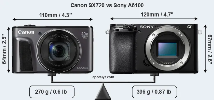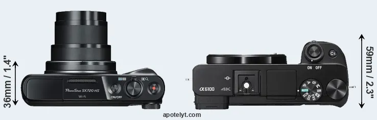 The physical size and weight of the Canon SX720 and the Sony A6100 are illustrated in the side-by-side display below. The two cameras are presented according to their relative size. Three consecutive views from the front, the top, and the rear side are shown. All size dimensions are rounded to the nearest millimeter.