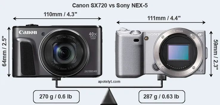 The side-by-side display below illustrates the physical size and weight of the Canon SX720 and the Sony NEX-5. The two cameras are presented according to their relative size. Three consecutive perspectives from the front, the top, and the back are available. All width, height and depth measures are rounded to the nearest millimeter.