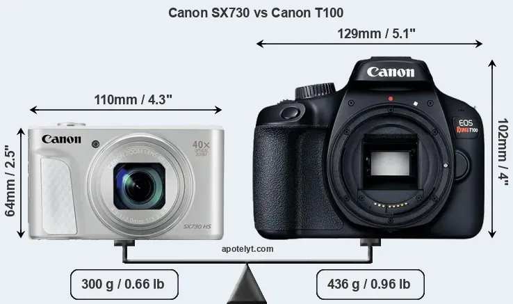 The above size and weight comparisons are to some extent incomplete and possibly misleading, as the SX730 has a lens built in, whereas the T100 is an interchangeable lens camera that requires a separate lens. Attaching the latter will add extra weight and bulk to the setup. You can compare the optics available for the T100 and their specifications in the Canon EF Lens Catalog.