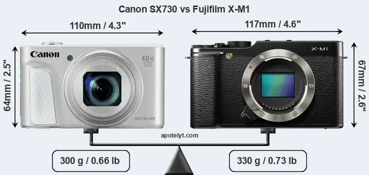 The above size and weight comparisons are to some extent incomplete and possibly misleading, as the SX730 has a lens built in, whereas the X-M1 is an interchangeable lens camera that requires a separate lens. Attaching the latter will add extra weight and bulk to the setup. You can compare the optics available for the X-M1 and their specifications in the Fujinon X Lens Catalog.