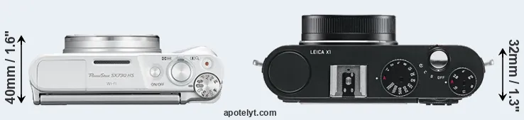 The physical size and weight of the Canon SX730 and the Leica X1 are illustrated in the side-by-side display below. The two cameras are presented according to their relative size. Three consecutive perspectives from the front, the top, and the back are available. All width, height and depth dimensions are rounded to the nearest millimeter.