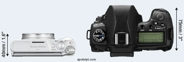 The above size and weight comparisons are to some extent incomplete and possibly misleading, as the SX730 has a lens built in, whereas the E-30 is an interchangeable lens camera that requires a separate lens. Attaching the latter will add extra weight and bulk to the setup. You can compare the optics available for the E-30 and their specifications in the Four Thirds Lens Catalog.