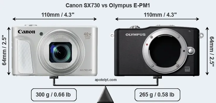 In this particular case, the Canon SX730 and the Olympus E-PM1 have exactly the same width and height, and, thus, have identically-sized bodies. In this context, it is worth noting that neither the SX730 nor the E-PM1 are weather-sealed.