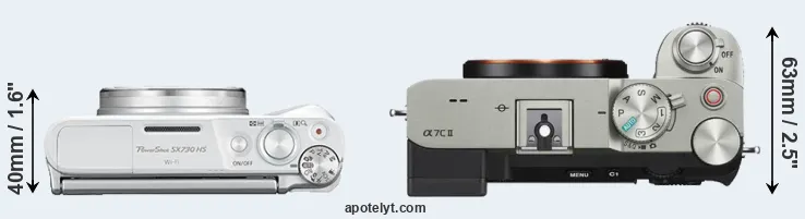 The above size and weight comparisons are to some extent incomplete and possibly misleading, as the SX730 has a lens built in, whereas the A7C II is an interchangeable lens camera that requires a separate lens. Attaching the latter will add extra weight and bulk to the setup. You can compare the optics available for the A7C II and their specifications in the Sony FE Lens Catalog.