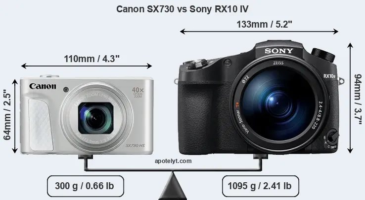 If the front view area (width x height) of the cameras is taken as an aggregate measure of their size, the Sony RX10 IV is considerably larger (78 percent) than the Canon SX730. Moreover, the RX10 IV is substantially heavier (265 percent) than the SX730. It is noteworthy in this context that the RX10 IV is splash and dust-proof, while the SX730 does not feature any corresponding weather-sealing.
