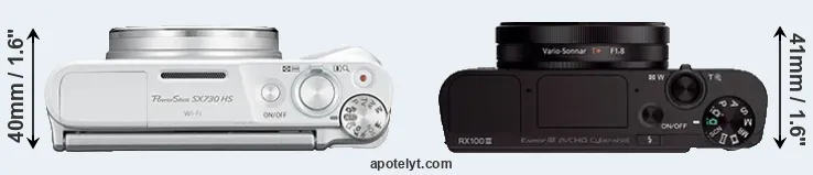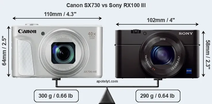 An illustration of the physical size and weight of the Canon SX730 and the Sony RX100 III is provided in the side-by-side display below. The two cameras are presented according to their relative size. Three successive views from the front, the top, and the rear are shown. All size dimensions are rounded to the nearest millimeter.