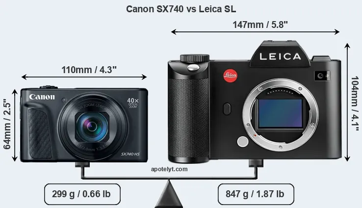 The physical size and weight of the Canon SX740 and the Leica SL are illustrated in the side-by-side display below. The two cameras are presented according to their relative size. Three successive views from the front, the top, and the rear are shown. All size dimensions are rounded to the nearest millimeter.