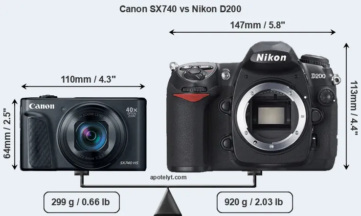 An illustration of the physical size and weight of the Canon SX740 and the Nikon D200 is provided in the side-by-side display below. The two cameras are presented according to their relative size. Three consecutive views from the front, the top, and the rear side are shown. All width, height and depth dimensions are rounded to the nearest millimeter.