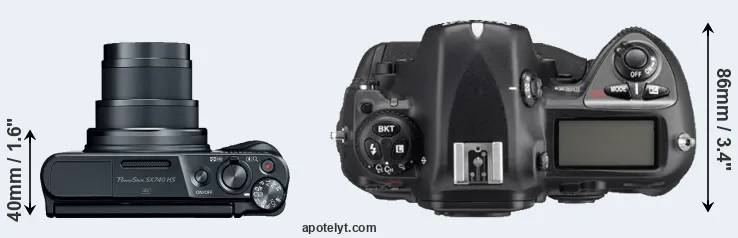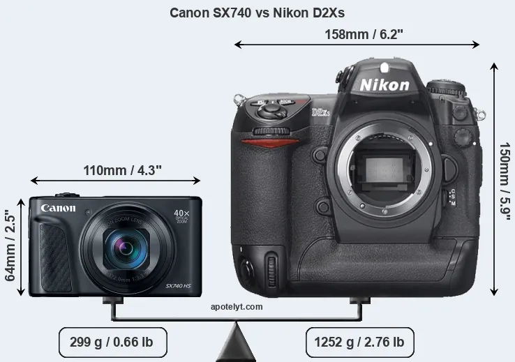 If the front view area (width x height) of the cameras is taken as an aggregate measure of their size, the Nikon D2Xs is considerably larger (237 percent) than the Canon SX740. It is noteworthy in this context that the D2Xs is splash and dust-proof, while the SX740 does not feature any corresponding weather-sealing.