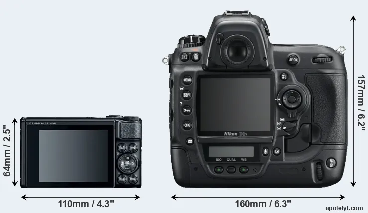 If the front view area (width x height) of the cameras is taken as an aggregate measure of their size, the Nikon D3S is considerably larger (257 percent) than the Canon SX740. It is noteworthy in this context that the D3S is splash and dust-proof, while the SX740 does not feature any corresponding weather-sealing.