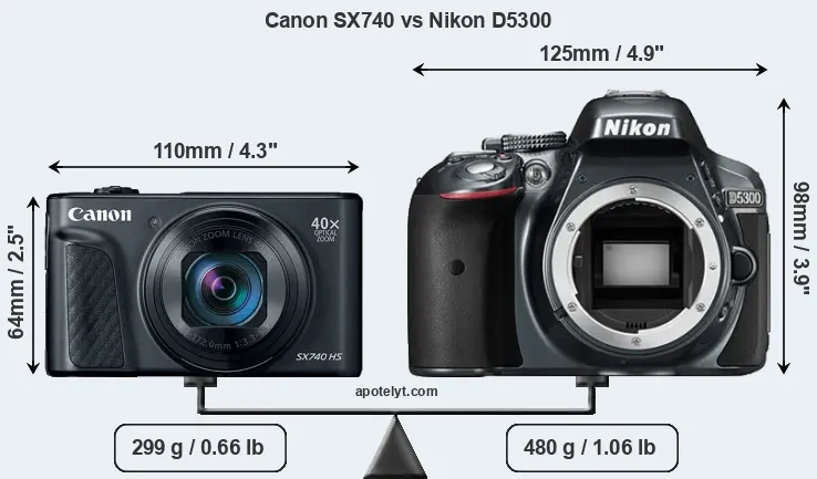 The physical size and weight of the Canon SX740 and the Nikon D5300 are illustrated in the side-by-side display below. The two cameras are presented according to their relative size. Three consecutive perspectives from the front, the top, and the back are available. All width, height and depth measures are rounded to the nearest millimeter.