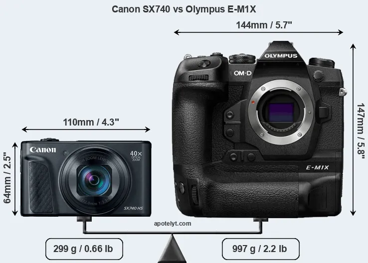 The side-by-side display below illustrates the physical size and weight of the Canon SX740 and the Olympus E-M1X. The two cameras are presented according to their relative size. Three consecutive perspectives from the front, the top, and the back are available. All width, height and depth dimensions are rounded to the nearest millimeter.