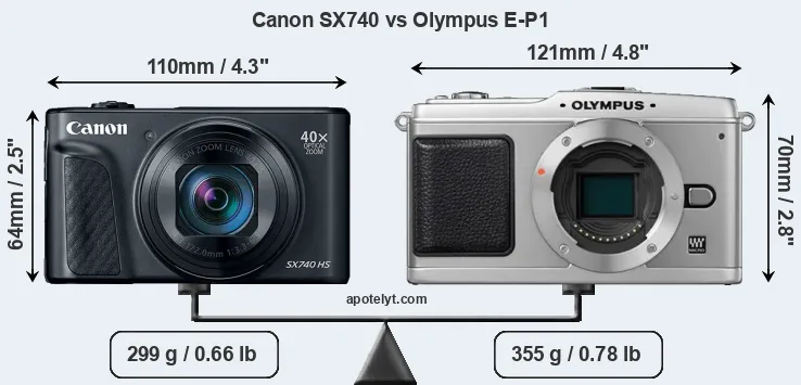 The side-by-side display below illustrates the physical size and weight of the Canon SX740 and the Olympus E-P1. The two cameras are presented according to their relative size. Three consecutive perspectives from the front, the top, and the back are available. All size dimensions are rounded to the nearest millimeter.