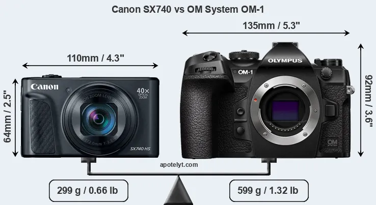 The above size and weight comparisons are to some extent incomplete and possibly misleading, as the SX740 has a lens built in, whereas the OM-1 is an interchangeable lens camera that requires a separate lens. Attaching the latter will add extra weight and bulk to the setup. You can compare the optics available for the OM-1 and their specifications in the Micro Four Thirds Lens Catalog.