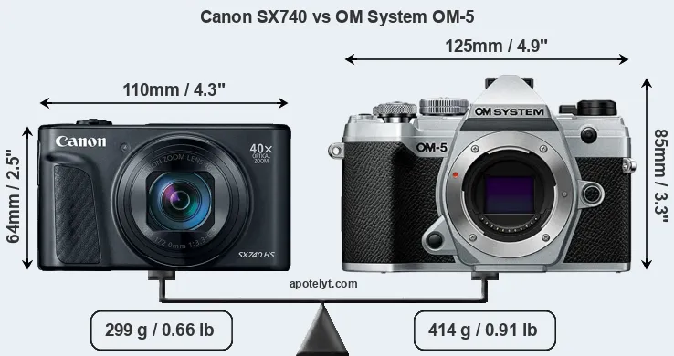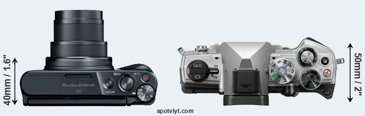 The above size and weight comparisons are to some extent incomplete and possibly misleading, as the SX740 has a lens built in, whereas the OM-5 is an interchangeable lens camera that requires a separate lens. Attaching the latter will add extra weight and bulk to the setup. You can compare the optics available for the OM-5 and their specifications in the Micro Four Thirds Lens Catalog.