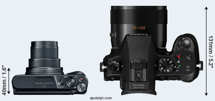 The physical size and weight of the Canon SX740 and the Panasonic FZ1000 are illustrated in the side-by-side display below. The two cameras are presented according to their relative size. Three successive views from the front, the top, and the rear are shown. All width, height and depth measures are rounded to the nearest millimeter.