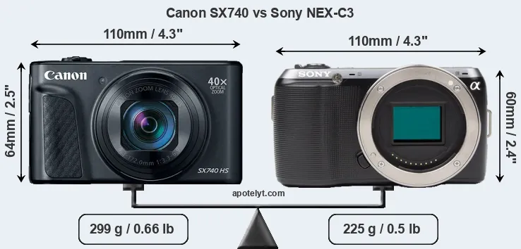 An illustration of the physical size and weight of the Canon SX740 and the Sony NEX-C3 is provided in the side-by-side display below. The two cameras are presented according to their relative size. Three consecutive perspectives from the front, the top, and the back are available. All width, height and depth dimensions are rounded to the nearest millimeter.