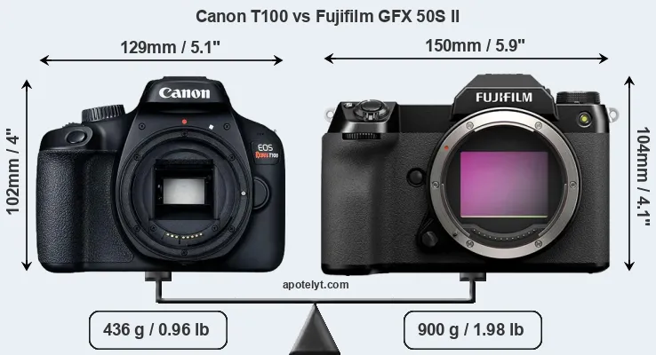 An illustration of the physical size and weight of the Canon T100 and the Fujifilm GFX 50S II is provided in the side-by-side display below. The two cameras are presented according to their relative size. Three consecutive perspectives from the front, the top, and the back are available. All size dimensions are rounded to the nearest millimeter.