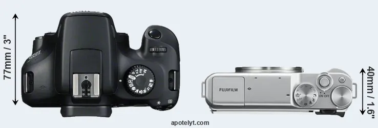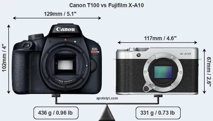 The side-by-side display below illustrates the physical size and weight of the Canon T100 and the Fujifilm X-A10. The two cameras are presented according to their relative size. Three consecutive perspectives from the front, the top, and the back are available. All size dimensions are rounded to the nearest millimeter.