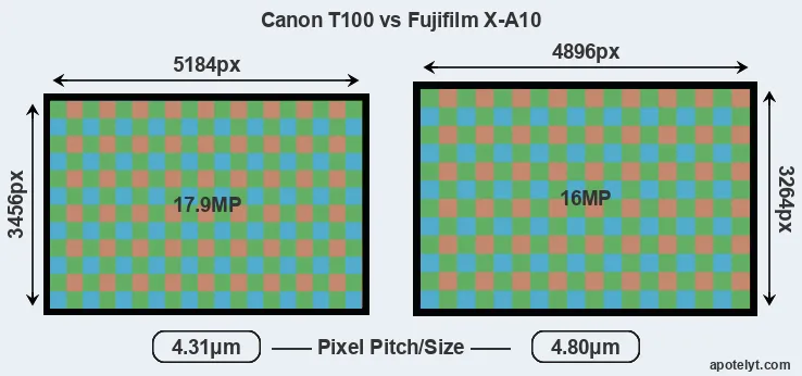 Despite having a smaller sensor, the Canon T100 offers a higher resolution of 17.9 megapixels, compared with 16 MP of the Fujifilm X-A10. This megapixels advantage comes at the cost of a higher pixel density and a smaller size of the individual pixel (with a pixel pitch of 4.31μm versus 4.80μm for the X-A10). However, it should be noted that the T100 is a somewhat more recent model (by 1 year and 2 months) than the X-A10, and its sensor might have benefitted from technological advances during this time that partly offset its pixel-size disadvantage.