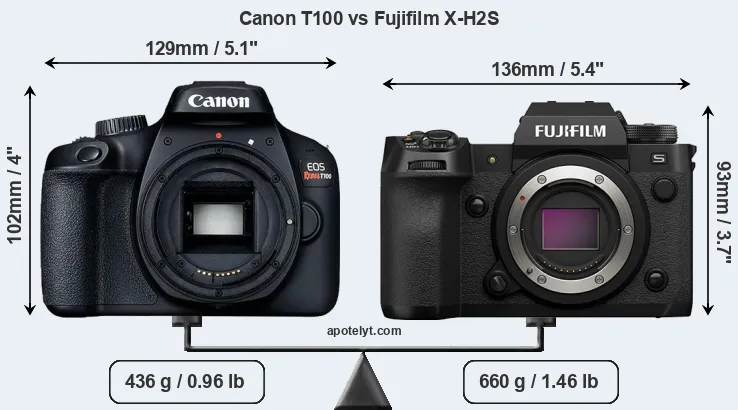 If the front view area (width x height) of the cameras is taken as an aggregate measure of their size, the Fujifilm X-H2S is somewhat smaller (4 percent) than the Canon T100. However, the X-H2S is substantially heavier (51 percent) than the T100. It is noteworthy in this context that the X-H2S is splash and dust-proof, while the T100 does not feature any corresponding weather-sealing.