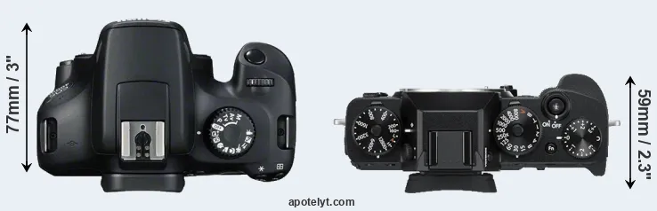 The above size and weight comparisons are to some extent incomplete since they do not consider the interchangeable lenses that both of these cameras require. Both cameras have similarly sized sensors, but DSLRs have a larger flange-to-focal plane distance than mirrorless cameras, which imposes contraints on the optical engineering process and generally leads to bigger and heavier lenses. You can compare the optics available for the two cameras in the Canon EF Lens Catalog (T100) and the Fujinon X Lens Catalog (X-T3). Mirrorless cameras, such as the X-T3, have moreover the advantage that they can use many lenses from other systems via adapters, as they have a relatively short flange to focal plane distance.