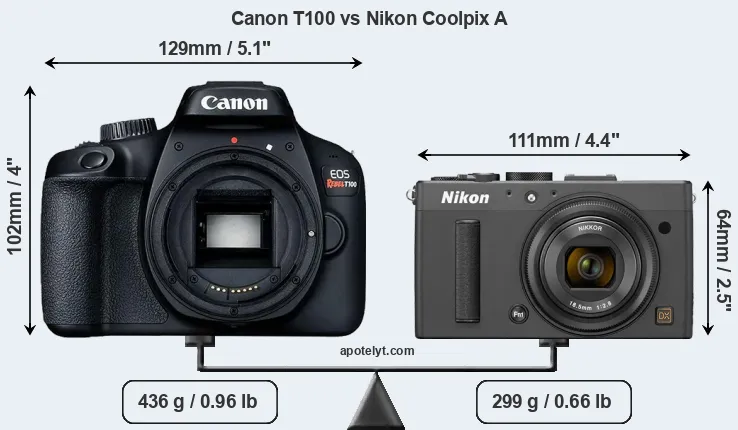 The side-by-side display below illustrates the physical size and weight of the Canon T100 and the Nikon Coolpix A. The two cameras are presented according to their relative size. Three consecutive views from the front, the top, and the rear side are shown. All width, height and depth dimensions are rounded to the nearest millimeter.