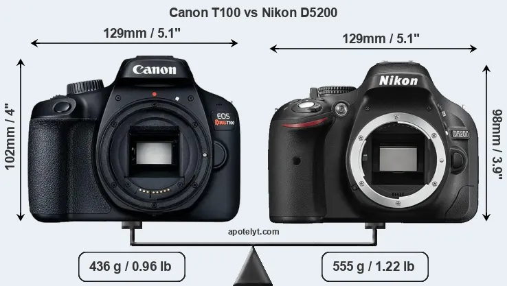 An illustration of the physical size and weight of the Canon T100 and the Nikon D5200 is provided in the side-by-side display below. The two cameras are presented according to their relative size. Three consecutive views from the front, the top, and the rear side are shown. All width, height and depth measures are rounded to the nearest millimeter.