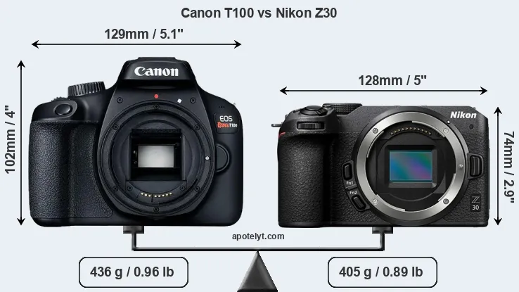 The physical size and weight of the Canon T100 and the Nikon Z30 are illustrated in the side-by-side display below. The two cameras are presented according to their relative size. Three successive views from the front, the top, and the rear are shown. All width, height and depth measures are rounded to the nearest millimeter.