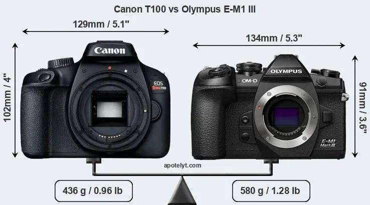 The side-by-side display below illustrates the physical size and weight of the Canon T100 and the Olympus E-M1 III. The two cameras are presented according to their relative size. Three consecutive perspectives from the front, the top, and the back are available. All width, height and depth measures are rounded to the nearest millimeter.