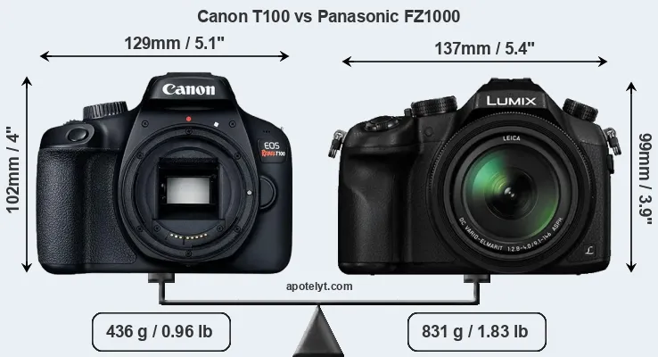 The side-by-side display below illustrates the physical size and weight of the Canon T100 and the Panasonic FZ1000. The two cameras are presented according to their relative size. Three consecutive perspectives from the front, the top, and the back are available. All width, height and depth measures are rounded to the nearest millimeter.