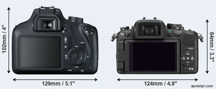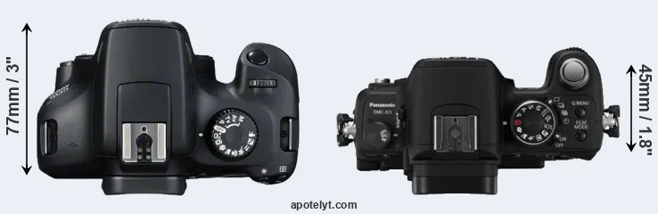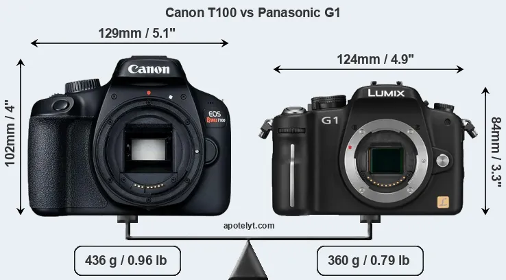 An illustration of the physical size and weight of the Canon T100 and the Panasonic G1 is provided in the side-by-side display below. The two cameras are presented according to their relative size. Three successive views from the front, the top, and the rear are shown. All size dimensions are rounded to the nearest millimeter.