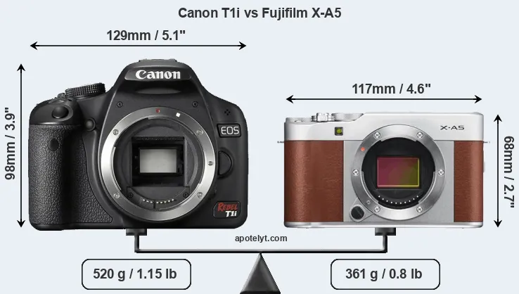 The physical size and weight of the Canon T1i and the Fujifilm X-A5 are illustrated in the side-by-side display below. The two cameras are presented according to their relative size. Three successive views from the front, the top, and the rear are shown. All size dimensions are rounded to the nearest millimeter.