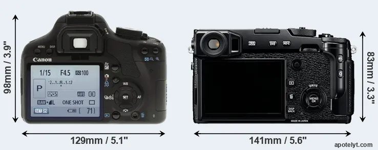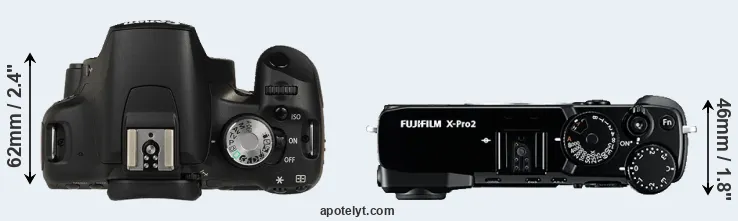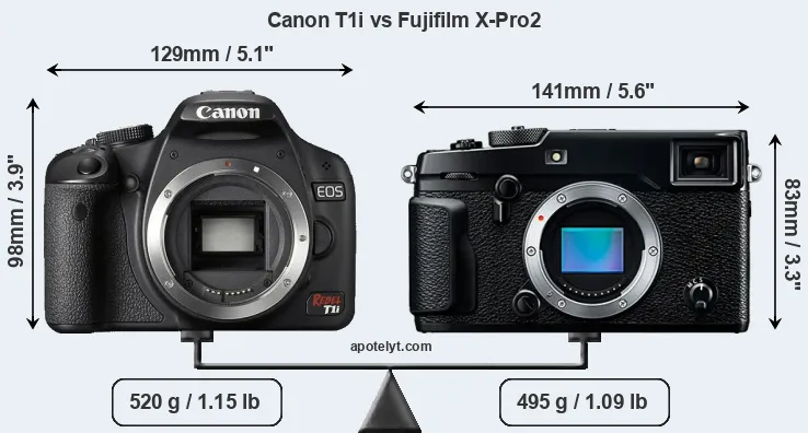 The side-by-side display below illustrates the physical size and weight of the Canon T1i and the Fujifilm X-Pro2. The two cameras are presented according to their relative size. Three consecutive perspectives from the front, the top, and the back are available. All width, height and depth measures are rounded to the nearest millimeter.