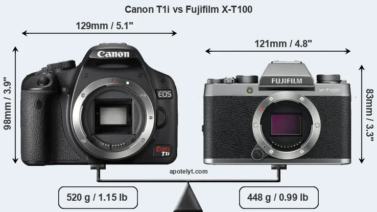 The side-by-side display below illustrates the physical size and weight of the Canon T1i and the Fujifilm X-T100. The two cameras are presented according to their relative size. Three consecutive perspectives from the front, the top, and the back are available. All width, height and depth measures are rounded to the nearest millimeter.