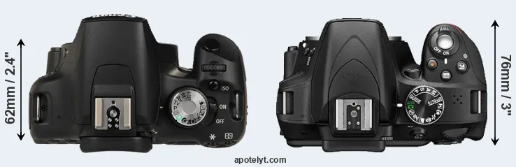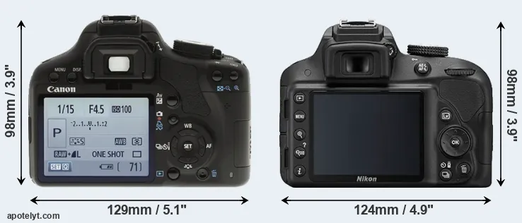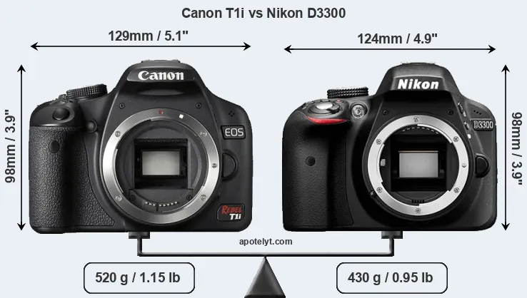 The physical size and weight of the Canon T1i and the Nikon D3300 are illustrated in the side-by-side display below. The two cameras are presented according to their relative size. Three consecutive perspectives from the front, the top, and the back are available. All width, height and depth dimensions are rounded to the nearest millimeter.