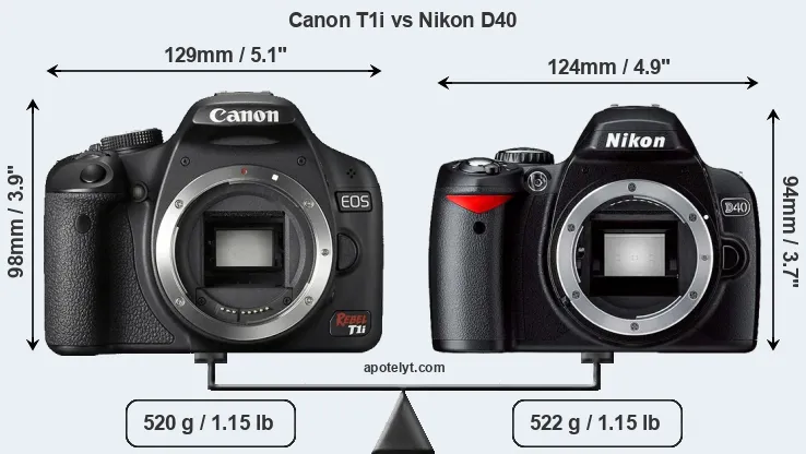 The physical size and weight of the Canon T1i and the Nikon D40 are illustrated in the side-by-side display below. The two cameras are presented according to their relative size. Three successive views from the front, the top, and the rear are shown. All width, height and depth dimensions are rounded to the nearest millimeter.