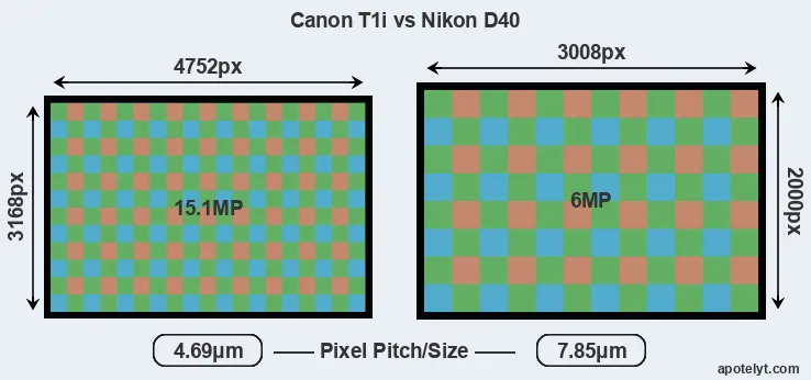Despite having a smaller sensor, the Canon T1i offers a higher resolution of 15.1 megapixels, compared with 6 MP of the Nikon D40. This megapixels advantage comes at the cost of a higher pixel density and a smaller size of the individual pixel (with a pixel pitch of 4.69μm versus 7.85μm for the D40). However, it should be noted that the T1i is much more recent (by 2 years and 4 months) than the D40, and its sensor will have benefitted from technological advances during this time that make it possible to gather light more efficiently.