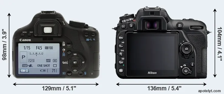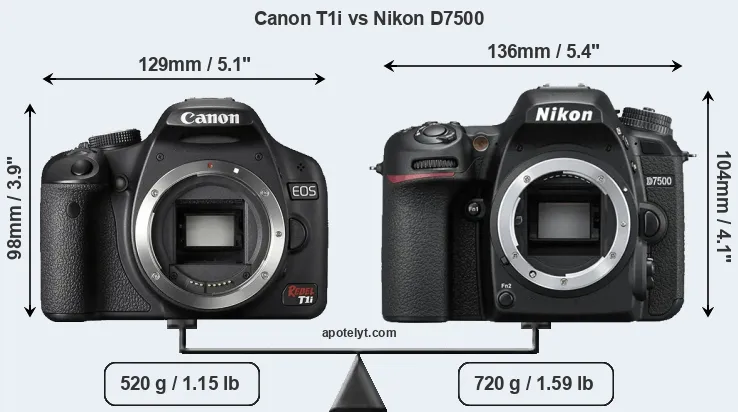 The side-by-side display below illustrates the physical size and weight of the Canon T1i and the Nikon D7500. The two cameras are presented according to their relative size. Three successive views from the front, the top, and the rear are shown. All width, height and depth dimensions are rounded to the nearest millimeter.