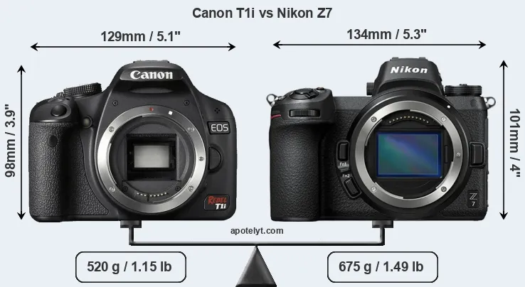 The side-by-side display below illustrates the physical size and weight of the Canon T1i and the Nikon Z7. The two cameras are presented according to their relative size. Three successive views from the front, the top, and the rear are shown. All size dimensions are rounded to the nearest millimeter.