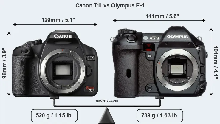 If the front view area (width x height) of the cameras is taken as an aggregate measure of their size, the Olympus E-1 is notably larger (16 percent) than the Canon T1i. Moreover, the E-1 is substantially heavier (42 percent) than the T1i. It is noteworthy in this context that the E-1 is splash and dust-proof, while the T1i does not feature any corresponding weather-sealing.