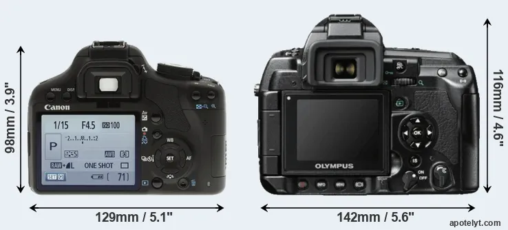 The side-by-side display below illustrates the physical size and weight of the Canon T1i and the Olympus E-3. The two cameras are presented according to their relative size. Three consecutive perspectives from the front, the top, and the back are available. All width, height and depth measures are rounded to the nearest millimeter.