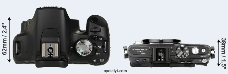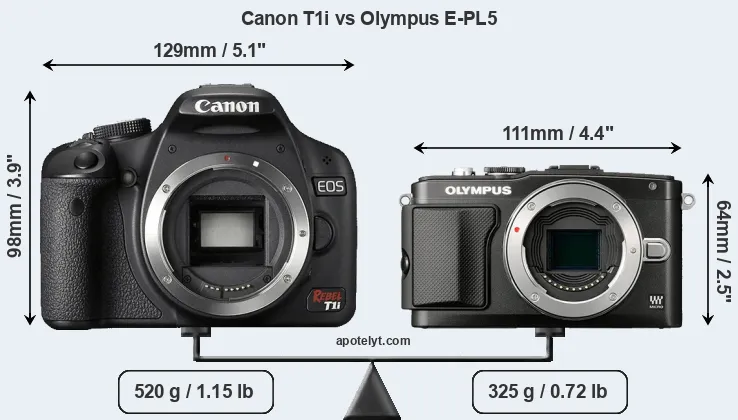 The side-by-side display below illustrates the physical size and weight of the Canon T1i and the Olympus E-PL5. The two cameras are presented according to their relative size. Three successive views from the front, the top, and the rear are shown. All width, height and depth measures are rounded to the nearest millimeter.