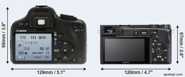 The physical size and weight of the Canon T1i and the Sony A6100 are illustrated in the side-by-side display below. The two cameras are presented according to their relative size. Three successive views from the front, the top, and the rear are shown. All size dimensions are rounded to the nearest millimeter.