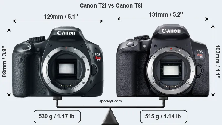 The physical size and weight of the Canon T2i and the Canon T8i are illustrated in the side-by-side display below. The two cameras are presented according to their relative size. Three consecutive views from the front, the top, and the rear side are shown. All size dimensions are rounded to the nearest millimeter.