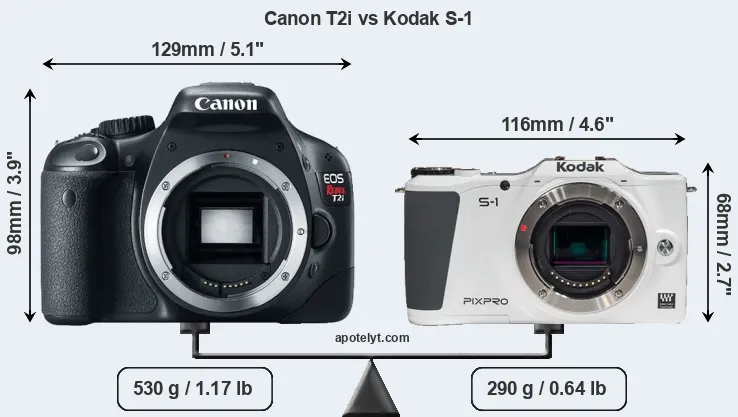 An illustration of the physical size and weight of the Canon T2i and the Kodak S-1 is provided in the side-by-side display below. The two cameras are presented according to their relative size. Three successive views from the front, the top, and the rear are shown. All width, height and depth dimensions are rounded to the nearest millimeter.